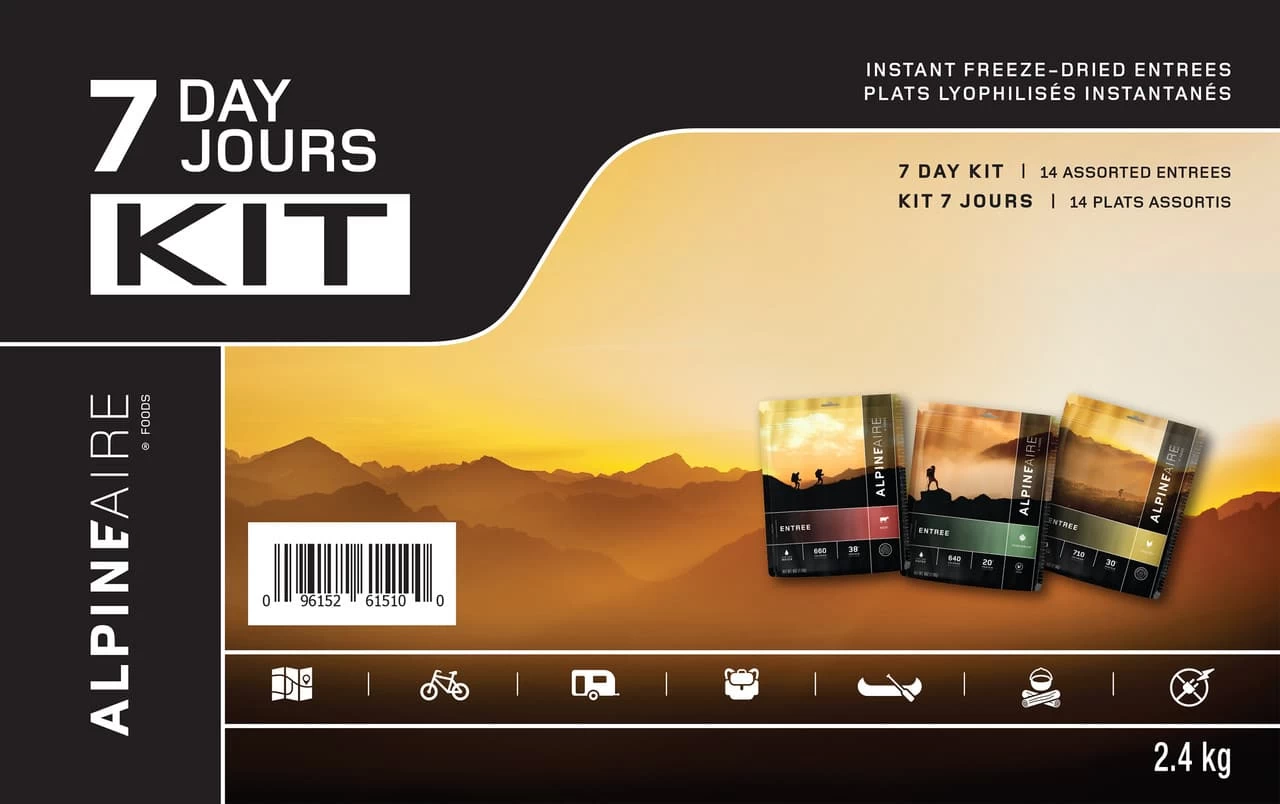 A grab-and-go meal solution for a backcountry trip or to add to your emergency preparedness kit. Enough for 7 days, the kit contains 14 tasty entrees.
