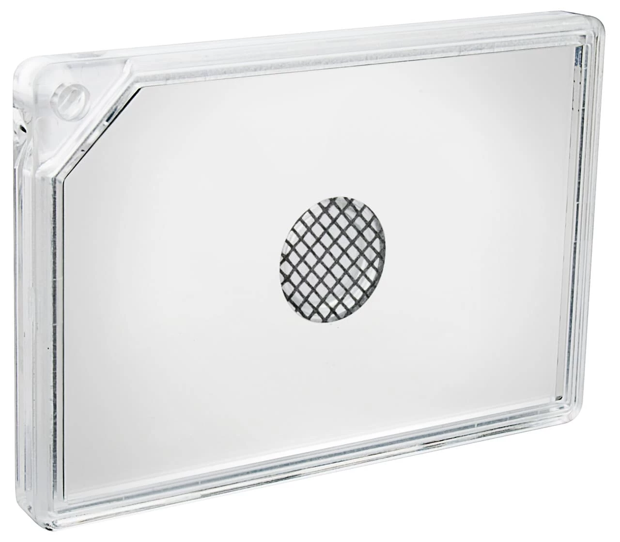 An acrylic case surrounds the glass mirror to protect it. It floats if you drop in water, and has a lanyard hole for slinging.