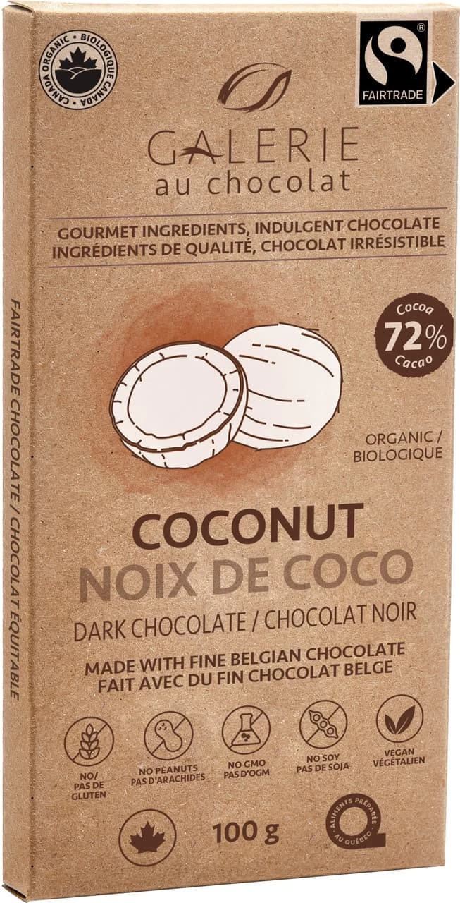 Creamy coconut and rich 72% cacao dark chocolate play perfectly off of each other in this decadent bar.