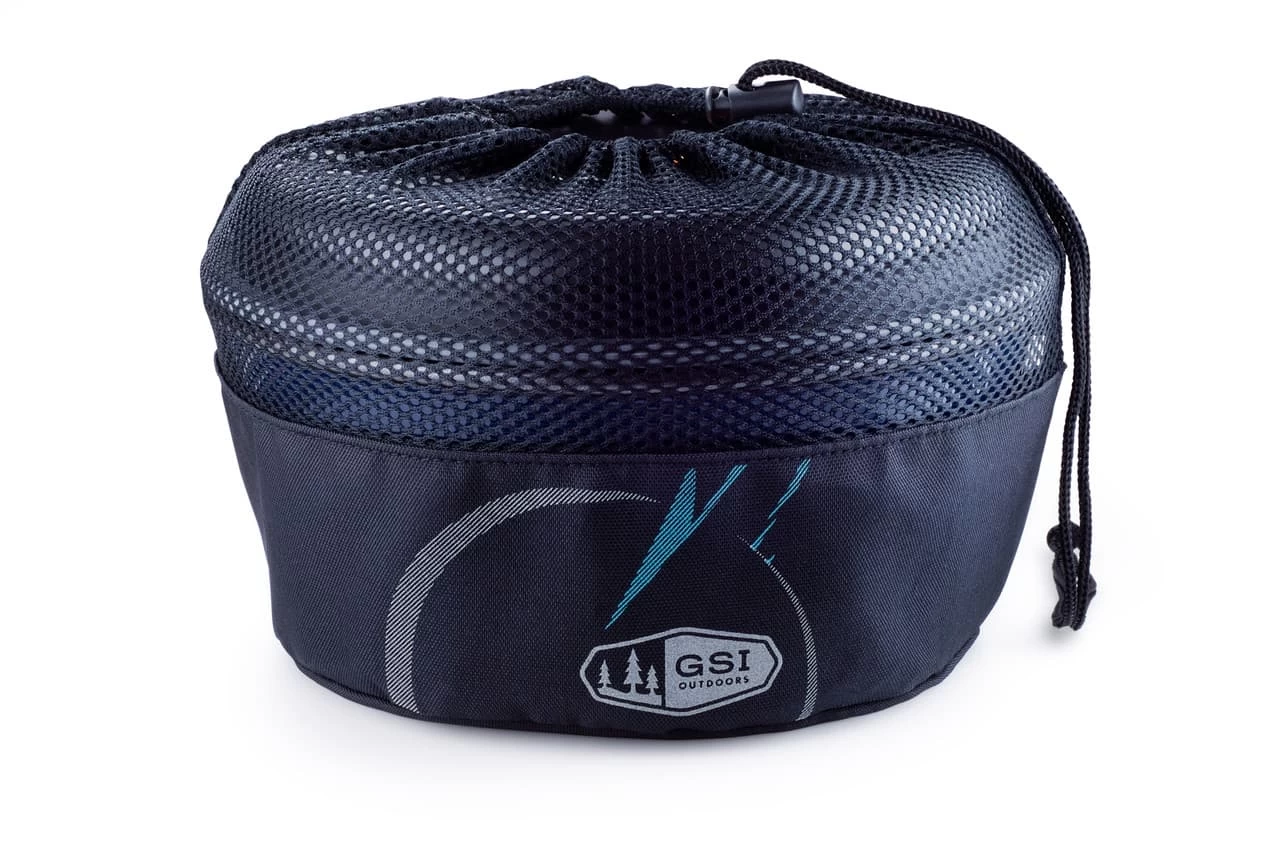 - Small set includes 1.5L and 2L pots with lids, frying pan, cutting board, pot gripper and mesh stuff sack