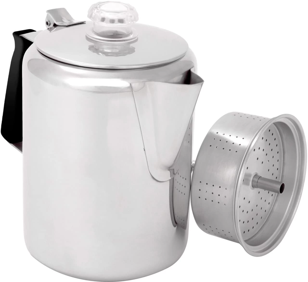 Now updated with an ergonomic, heat-resistant silicone handle and BPA-free resin knob, this durable stainless-steel 9-cup coffee percolator might be your new best camping buddy.