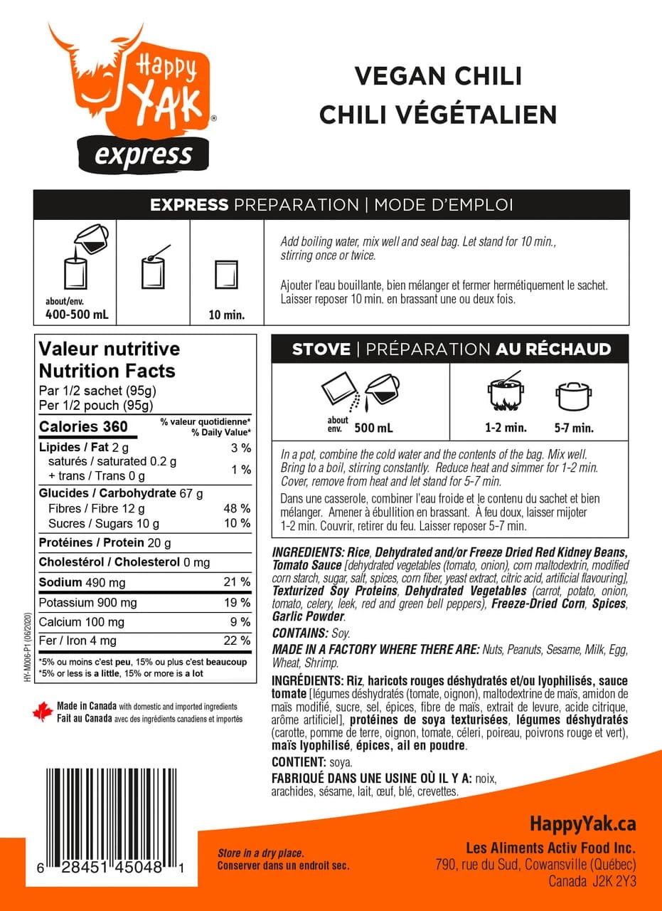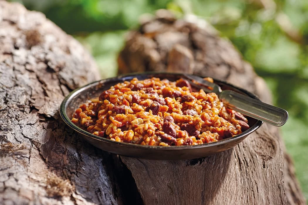 - Ingredients: rice, tomato sauce [dehydrated vegetables (tomato, onion), corn maltodextrin, modified corn starch, sugar, salt, spices, corn fiber, yeast extract, citric acid, artificial flavouring], dehydrated red kidney beans, texturized soy proteins, dehydrated vegetables (carrot, potato, onion, tomato, celery, leek, red and green bell peppers), freeze-dried corn, spices, garlic powder