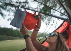 - Slide the organizer closer to your head or feet with tensioners and hooks