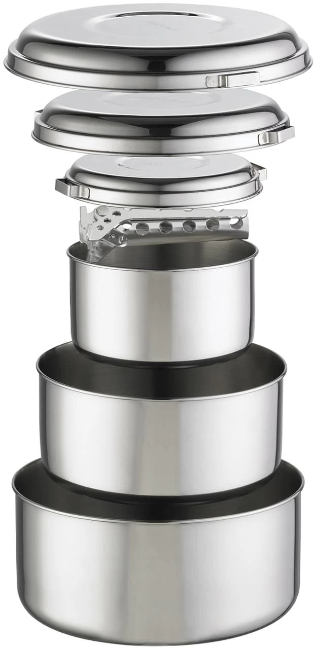 A multi-piece set that’s ideal for groups of four or more. The stainless steel is robust, and the pots can be scrubbed out with sand or pebbles. Intended for ongoing hard use rather than creating delicate haute cuisine. Folks aspiring to backcountry culinary wizardry may want to consider non-stick coated pots.