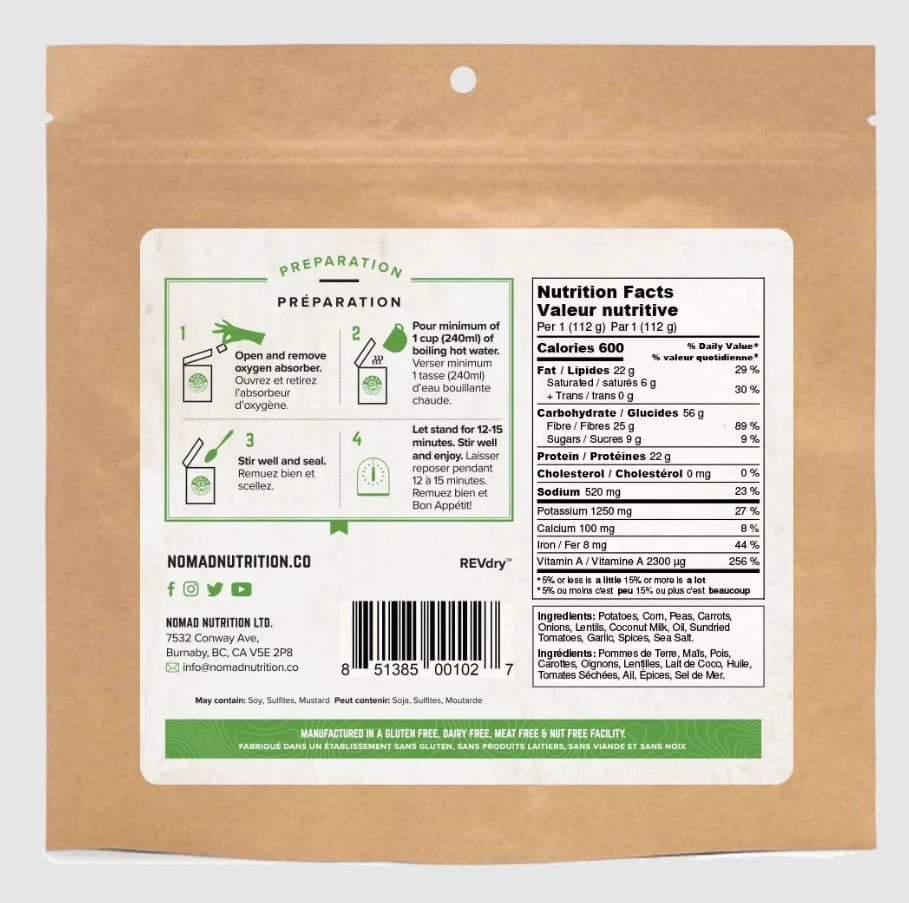 - Ingredients: potatoes, carrots, coconut milk, lentils, onions, peas, corn, olive oil, sundried tomatoes, garlic, spices and sea salt
